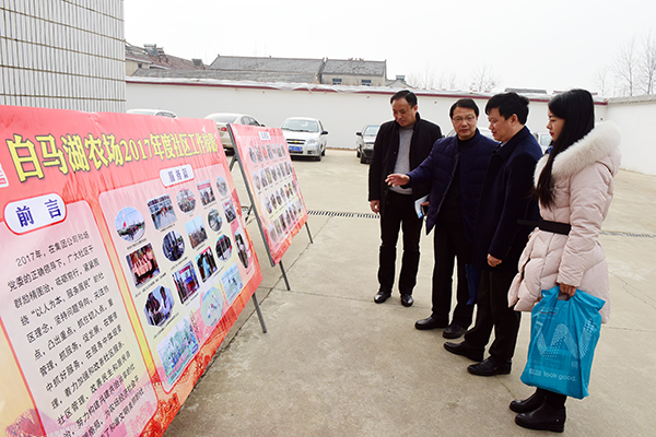1月19日,由集團公司人力資源部、社會事業部、資產經營部、審計監察部組成的聯合考核組一行到白馬湖農場對2017年度重點工作完成情況及所取得主要成績等進行綜合考核,農場領導姚春華、韓躍武及相關部門負責人陪同考核并匯報情況。