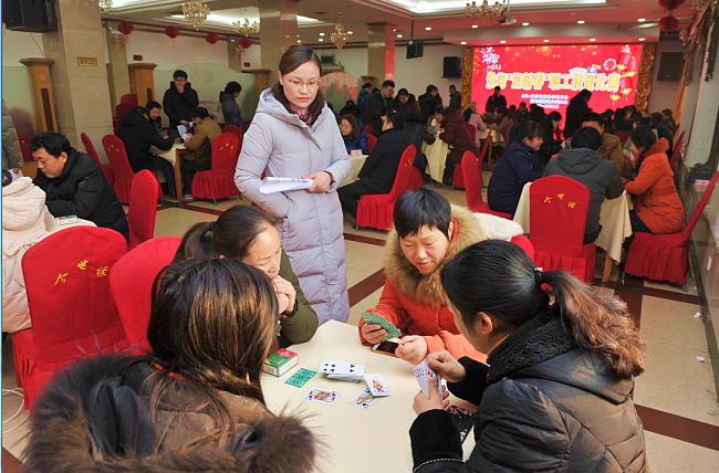 21日上午,雖然戶外寒氣襲人,但在淮海職教中心大廳內(nèi)卻是暖意融融。淮海工會(huì)2018迎新春”職工摜蛋比賽早晨8點(diǎn)準(zhǔn)時(shí)開賽,淮海米業(yè)由姜雪萍、周麗,張洋、梁長(zhǎng)軍組成的代表隊(duì)在工會(huì)主席潘長(zhǎng)干的帶領(lǐng)下,與農(nóng)場(chǎng)各單位推選的共62名男女選手一起,參加了“迎新春”摜蛋比賽角逐