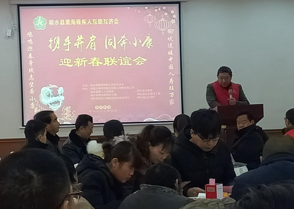 2月7日,“攜手并肩 同奔小康---迎新春聯誼會”,在響水縣金山大酒店隆重舉行,響水縣黃海殘疾人互助互濟會會長何顏軍致歡迎詞,縣殘聯張副理事長發表講話,關工委潘副秘書長、民政局薛科長等部門領導參加會議,中國人壽保險公司響水縣支公司、響水第三人民醫院、東方醫院等贊助單位代表到場祝賀,縣電視臺從頭到尾跟蹤采訪報道。