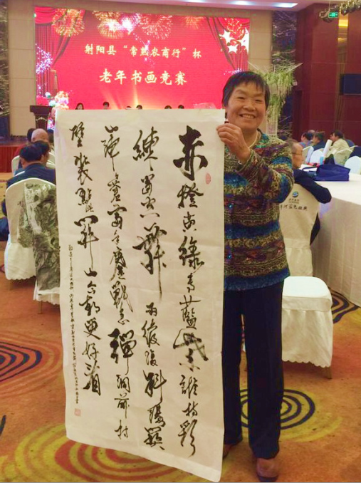 據了解,趙梅生原是江蘇農墾淮海農場石油機械廠的退休職工,她不但能寫一手瀟灑的字,而且小篆、隸書、楷書、草書等書法樣樣精通,家中存有一卷一卷的各類書法作品;經她創作的人物肖像、山水畫、素描等作品,家中堆成了一摞一摞的。對特別鐘意、栩栩如生的繪畫,她總是裝裱起來,掛在大廳或是送給友人。無論是在上海普佗區陽光二居委書畫協會出版的《晚霞余輝》書畫作品選中,還是農場書畫室陳列的精品展上,我們都可看到趙梅生的名字和熟悉的畫,沒有想到今年已是73歲的她,還能寫畫出如此逼真、如此飄曳的書法書畫,真是看了令人嘆為觀止。2016年7月,趙梅生書寫的小篆“勿忘抗日戰爭,頌揚民族精神,反對侵略占領,維護世界和平”排在了拾貝軒網絡書法展第9名;同年10月,在射陽縣老齡協會、縣老齡辦聯合主辦的射陽縣“常熟農商行”杯老年書畫競賽上,趙梅生的草書又獲得了二等獎;2017年在砥礪奮進的江蘇農墾書畫大賽上,趙梅生又以一幅山水畫、一幅草書獲得了江蘇農墾“喜迎十九大和集團黨代會、喜慶江蘇農墾成立65周年”書畫作品展優秀作品。