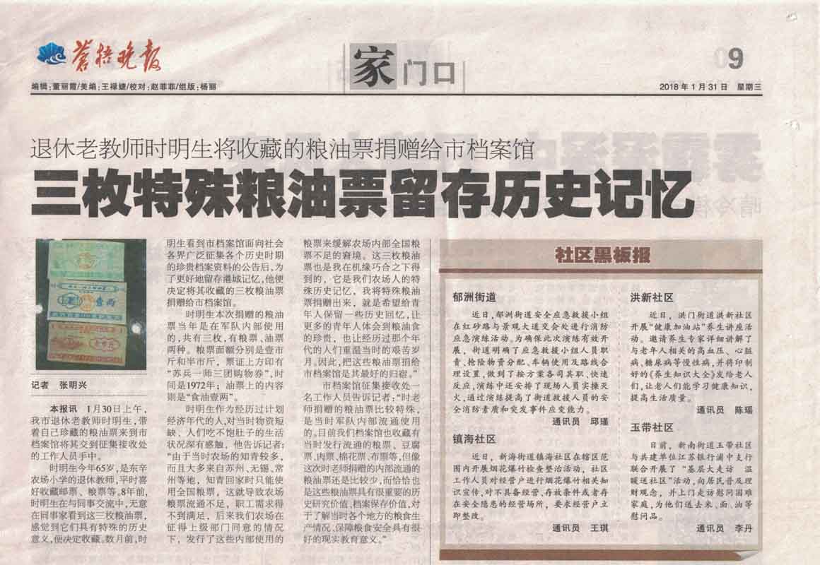 日前,《蒼梧晚報(bào)》在三版頭條位置刊登了《三枚特殊糧油票留存歷史記憶》的新聞報(bào)道,主要講述了東辛農(nóng)場退休老教師將自己珍藏多年文革期間的糧油票捐贈(zèng)給連云港市檔案館的先進(jìn)事跡。