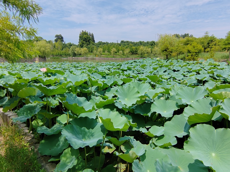隨著氣溫持續(xù)升高,公園內的荷花競相開放,荷葉碧翠欲滴,展現(xiàn)一副接天蓮葉無窮碧,映日荷花別樣紅的魅力畫卷,讓人感受到一絲絲涼意。周邊居民陳先生“有了荷花,這里的夏天更加漂亮了”。湖邊是垂柳依依,隨風浮動。荷葉一個接著一個鋪了滿塘,有的盛著晶瑩剔透的水珠,不禁想起小時候不懂事,會把荷葉折下來,拿在手中轉圈圈。