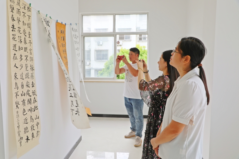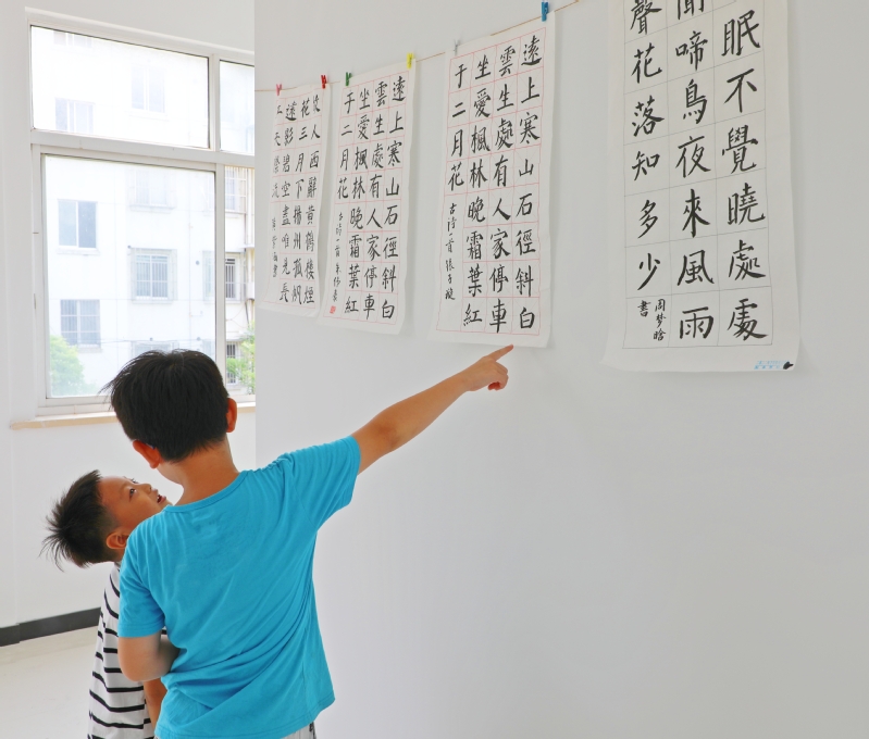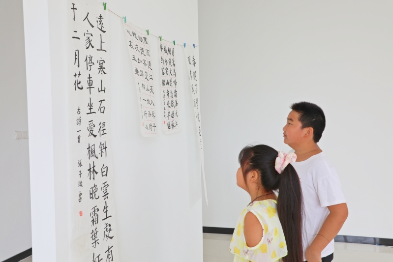8月28日,在江心沙職工書屋二樓,一場為期一周,象征著收獲的青少年書法展,吸引了不少職工居民和學生前來觀覽。圖為“書迷”們觀摩“暑期公益課堂·書法班”“結業”作品的溫馨場景。