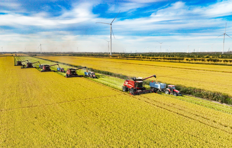2023年10月28日,在蘇墾農(nóng)發(fā)新洋分公司新南生產(chǎn)區(qū)19大隊(duì)的高標(biāo)準(zhǔn)農(nóng)田上,五臺(tái)凱斯7088大型聯(lián)合收割機(jī)穿梭在稻田中搶收水稻。蘇墾農(nóng)發(fā)新洋分公司搶抓晴好天氣,發(fā)揮農(nóng)墾企業(yè)機(jī)械化優(yōu)勢(shì),確保秋糧顆粒歸倉(cāng)。