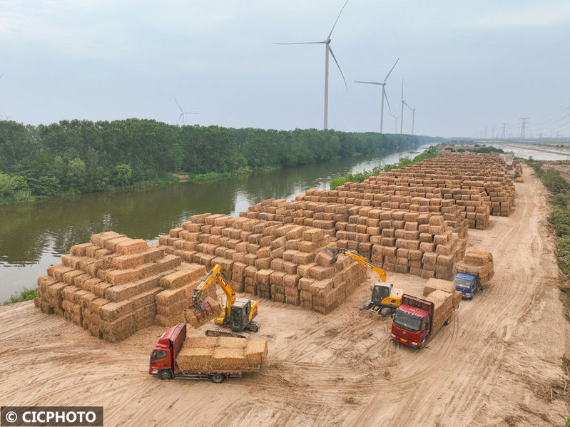↑2025年6月7日,在位于江蘇省鹽城市射陽縣的江蘇農墾新洋農場秸稈回收中心,農民駕駛機械整理回收的小麥秸稈。(無人機照片)CICPHOTO/張偉生 攝