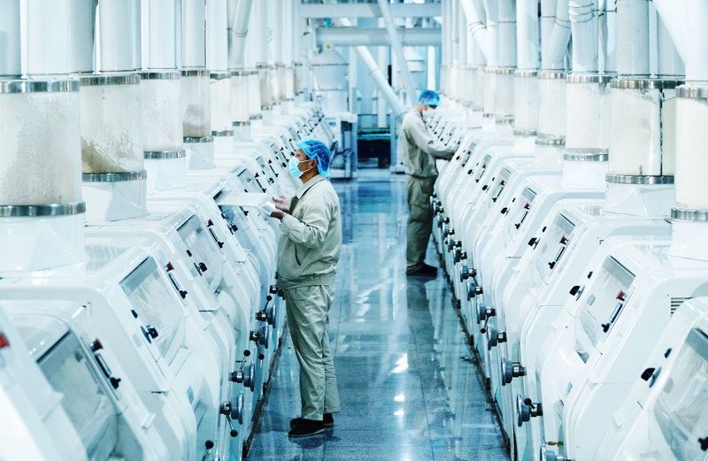 位于北京糧油食品應急保障中心園區東北角的古船食品福興面粉廠正開足馬力加緊生產。該廠建筑面積為2萬平方米,設計產能為日處理小麥1200噸、日產面粉800噸,生產近六七十種不同品類的產品,可滿足不同使用場景的消費需求。