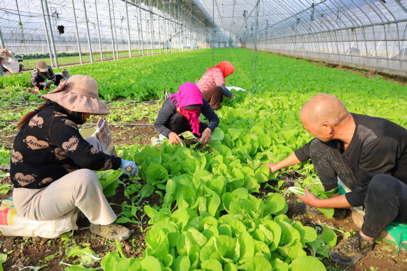 10月23日,江蘇省連云港市海州區的江蘇農墾崗埠農場,訂單蔬菜喜獲豐收。菜農們在大棚里采收整理新鮮的蔬菜,并進行打包稱重,田間地頭一片繁忙景象。近年來,當地大力發展規模化大棚蔬菜種植,采取“市場+訂單+農戶”的方式,促進菜農增收。