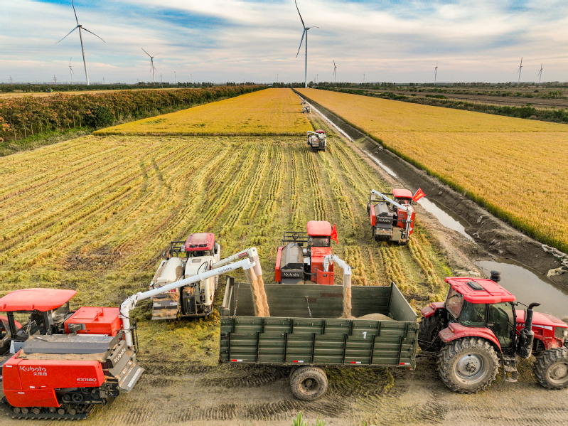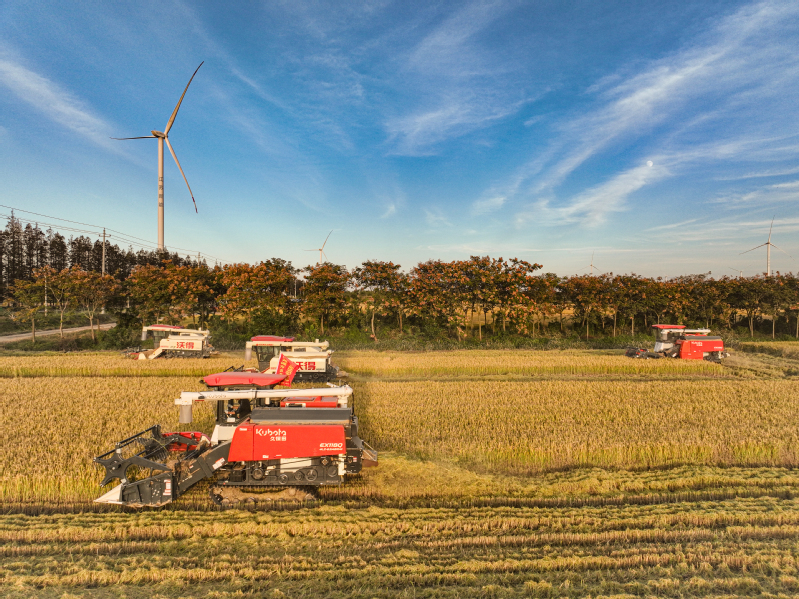 11月3日,江蘇省鹽城市射陽縣新洋農場組織收割機械,對高標準農田中的優質水稻進行搶收作業,確保秋糧顆粒歸倉,不誤農時。   作者:張偉生