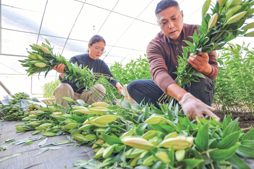 寒冬時節,江蘇農墾崗埠農場高效農業示范園11號大棚內一片春意盎然。一株株百合花挺拔站立,不少花苞已露出粉色,在綠葉的襯托下格外嬌艷動人。去年,崗埠農場高效農業示范園大力發展鮮切花產業,引進了“中國紅”“索蚌”等百合花品種,共種植14萬株。通過為周邊種植戶提供技術指導,農場帶動大家發展鮮切花產業。圖為工作人員正在整理百合鮮切花。