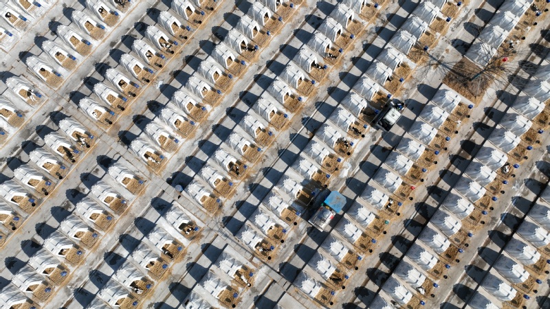 2月18日,蘇墾乳業(yè)工人在優(yōu)然牧業(yè)犢牛島添水加料、喂食牛犢。
