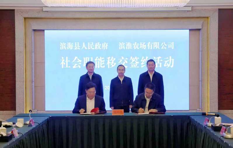 10月24日上午,濱淮農(nóng)場(chǎng)社會(huì)職能移交簽約活動(dòng)在濱海舉行。集團(tuán)黨委書(shū)記、董事長(zhǎng)吳本輝,濱海縣委書(shū)記吳啟標(biāo),集團(tuán)黨委委員、副總經(jīng)理劉衛(wèi)華,總經(jīng)理助理姚海洪,濱海縣副縣長(zhǎng)李品出席簽約活動(dòng)。濱海縣政協(xié)主席王海榮主持活動(dòng)。吳本輝表示,推進(jìn)企業(yè)辦社會(huì)職能改革,是新一輪國(guó)企改革的重要接續(xù)工作。濱淮實(shí)現(xiàn)農(nóng)場(chǎng)辦社會(huì)職能移交屬地管理,是雙方互信互利互贏的重要成果,也標(biāo)志著墾地融合發(fā)展邁出堅(jiān)實(shí)步伐。濱淮農(nóng)場(chǎng)要切實(shí)強(qiáng)化責(zé)任意識(shí),加強(qiáng)與濱海縣委、縣政府的溝通匯報(bào),有力有序推進(jìn)各項(xiàng)社會(huì)職能的移交工作。吳本輝指出,近年來(lái),濱海縣錨定經(jīng)濟(jì)指標(biāo)“總量靠前、增幅領(lǐng)先”、總體位次“沖刺全市第一方陣”的目標(biāo),以滿格狀態(tài)主動(dòng)作為、勇挑大梁,持續(xù)放大區(qū)位、產(chǎn)業(yè)、資源、生態(tài)等優(yōu)勢(shì),經(jīng)濟(jì)社會(huì)發(fā)展呈現(xiàn)出高歌猛進(jìn)、勢(shì)頭十足的良好態(tài)勢(shì)。當(dāng)前,江蘇農(nóng)墾正在深化落實(shí)“三大建設(shè)”,全力支持所屬農(nóng)場(chǎng)融入地方發(fā)展,培育壯大特色產(chǎn)業(yè)。希望以此次簽約為契機(jī),進(jìn)一步發(fā)揮墾地產(chǎn)業(yè)鏈協(xié)同優(yōu)勢(shì),推動(dòng)資源高效整合、深度融合,共同培育特色鮮明的農(nóng)業(yè)產(chǎn)業(yè)集群,打造墾地融合的“濱海樣板”,為推動(dòng)沿海地區(qū)高質(zhì)量發(fā)展、助力江蘇農(nóng)業(yè)現(xiàn)代化走在前作出新的更大貢獻(xiàn)。吳啟標(biāo)代表