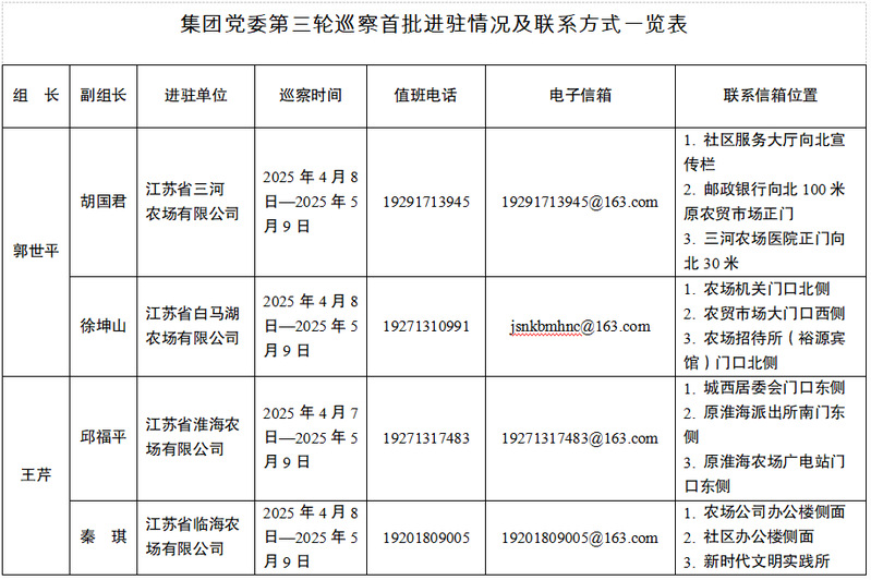 根據集團黨委部署,4月8日,集團黨委巡察組已完成對首批4家被巡察農場黨委的進駐工作。被巡察農場黨委分別召開巡察進駐動員會。集團黨委巡察組組長作動員講話,深入學習領會習近平總書記關于黨的自我革命的重要思想和巡視工作的重要論述,認真落實全省巡視巡察工作會議要求,通報本輪巡察工作重點和任務安排,對扎實開展巡察工作提出要求。集團黨委巡察組將堅持以習近平新時代中國特色社會主義思想為指導,圍繞高質量發展首要任務,把“四個聚焦”要求貫徹到巡察全過程,緊盯權力和責任、緊盯“一把手”和領導班子、緊盯群眾反映強烈的問題,實行農場、分公司、社區“三位一體”全覆蓋,深入查找影響高質量發展的主要矛盾、落實改革部署中的重大偏差,推動其各項工作高質量發展,為打造“清風在田”廉潔農墾,譜寫中國式現代化江蘇農墾新篇章提供堅強保障。集團黨委巡察組將在被巡察農場現場巡察1個月左右,期間設立專門值班電話、電子信箱、聯系信箱等,主要受理反映被巡察農場黨委領導班子及其成員、相關重點崗位干部(含已離退休、已調離)問題的來信來電來訪,重點是關于違反政治紀律、組織紀律、廉潔紀律、群眾紀律、工作紀律和生活紀律等方面的舉報和反映。其他不屬