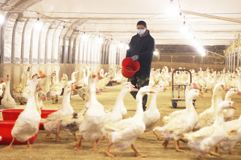 在臨海農(nóng)場種鵝養(yǎng)殖基地的鵝棚內(nèi),青年養(yǎng)殖人員正專心進(jìn)行喂食、撿蛋工作。