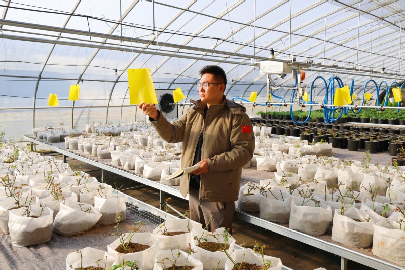 12月9日,江蘇農(nóng)墾崗埠農(nóng)場的科技育苗大棚,工作人員對今年新引進(jìn)栽植的盆栽月季、玫瑰花苗精準(zhǔn)修剪花苗的枯枝、弱枝,查看病蟲害發(fā)生情況,助力盆栽花苗平穩(wěn)過冬。