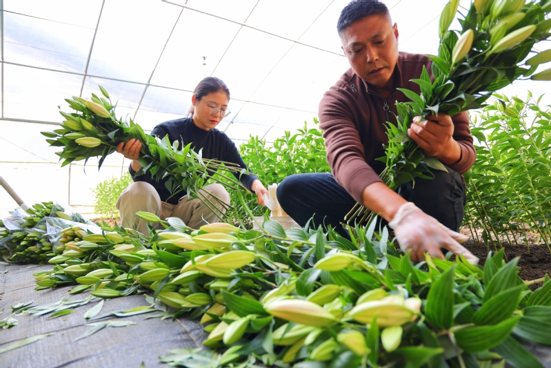寒冬時節(jié),崗埠農(nóng)場高效農(nóng)業(yè)示范園11號大棚內(nèi)一片春意盎然。一株株百合花挺拔站立,不少花苞已露出粉色,在綠葉的襯托下格外嬌艷動人。去年,崗埠農(nóng)場高效農(nóng)業(yè)示范園大力發(fā)展鮮切花產(chǎn)業(yè),引進(jìn)了“中國紅”“索蚌”等百合花品種,共種植14萬株。通過為周邊種植戶提供技術(shù)指導(dǎo),農(nóng)場帶動大家發(fā)展鮮切花產(chǎn)業(yè)。圖為工作人員正在整理百合鮮切花。