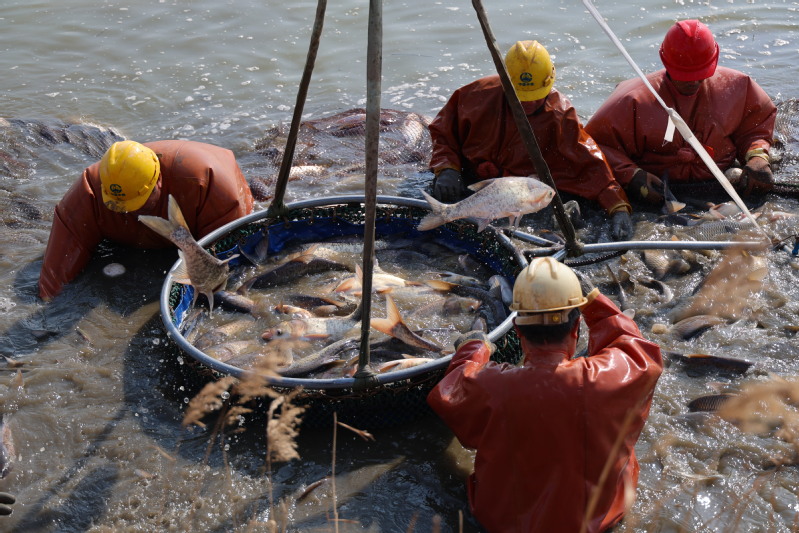 隨著2026年元旦臨近,水產市場需求量逐漸增大,崗埠農場積極做好鮮魚捕撈銷售工作,切實滿足節日市場需求。圖為農場加緊拉網捕撈鯉魚、花鰱、白鰱等各種鮮魚,準備供應云南昆明、山東濟寧等多地市場。