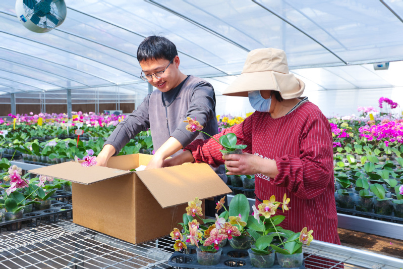 日前,云臺農(nóng)場蝴蝶蘭種植溫室內(nèi)一片繁忙景象,工作人員正有條不紊地將1500株精心培育的蝴蝶蘭苗打包裝箱。