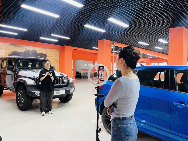 “牧馬人原廠配備全地形255 75R18輪胎、中控觸摸屏由8寸升級到12寸、涉水深度達760mm。”蘇舜錦尚公司(Jeep4S店)主播陳佳琪正通過直播間為客戶360°全方位展示和講解車輛配置,她耐心地解答客戶問題,1名客戶已成功預約進店。