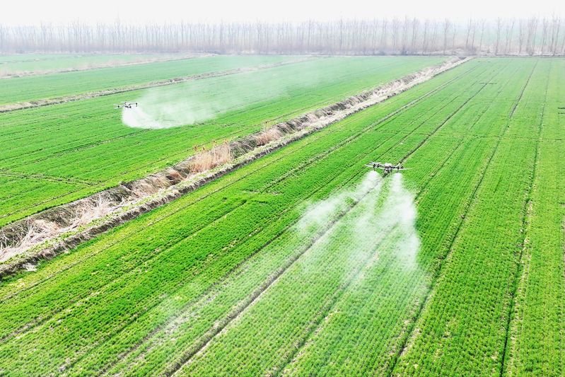 在省農(nóng)墾三河農(nóng)場邱上營分場的麥田里,植保無人機(jī)進(jìn)行飛防作業(yè)。顏懷峰 錢厚紅 攝