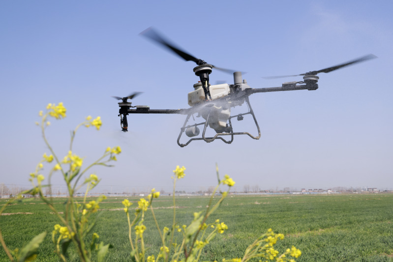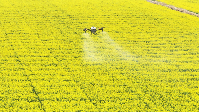 在蘇墾農(nóng)發(fā)臨海分公司25大隊油菜田上空,一架植保無人機(jī)正按照預(yù)設(shè)航線低空勻速飛行,細(xì)密的藥肥均勻地噴灑在每一株油菜上。
