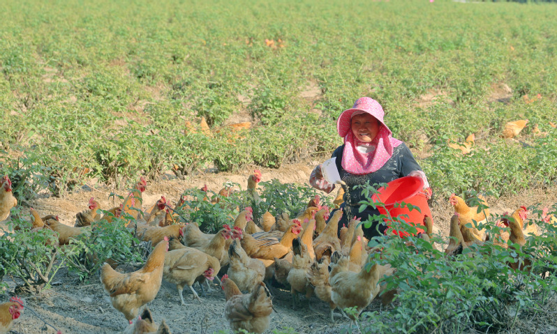 新曹農場大力擴展美麗經濟族群,利用大馬士革玫瑰摘花伐枝后的空檔期散養純種土雞。雞群在玫瑰園中盡情嬉戲、自由覓食,捉昆蟲,啄野草,食谷物,飲純露,純生態的玫瑰香雞和草雞蛋深受消費者喜愛。圖為養殖員在傍晚時分向雞群補飼玉米、麥麩等五谷雜糧,保證雞群吃得健康、長得健壯。