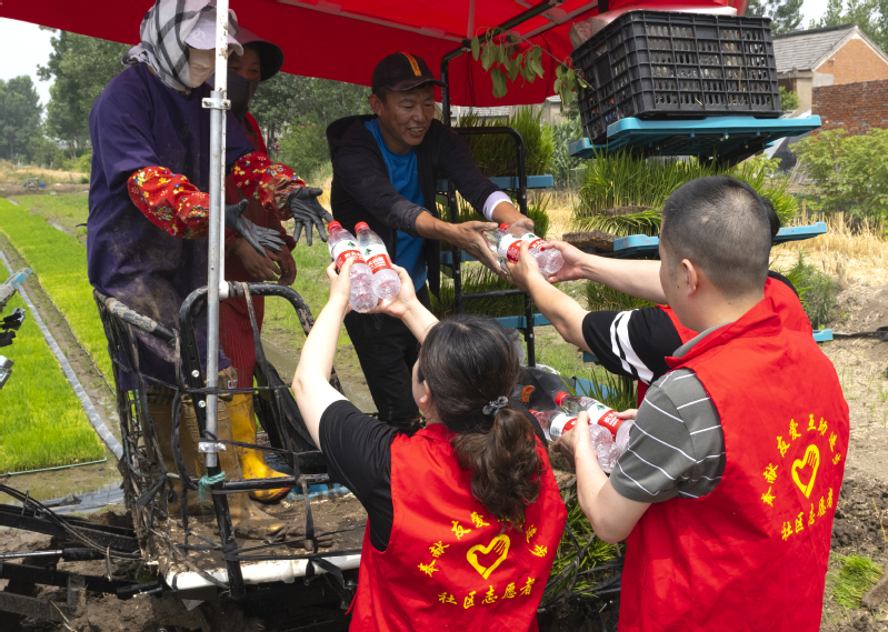 為搶抓農時,來自江西、黑龍江等省的多支機插秧團隊同時在白馬湖農場開展作業。圖為白馬湖組織志愿者為插秧團隊送上礦泉水等防暑降溫物資。