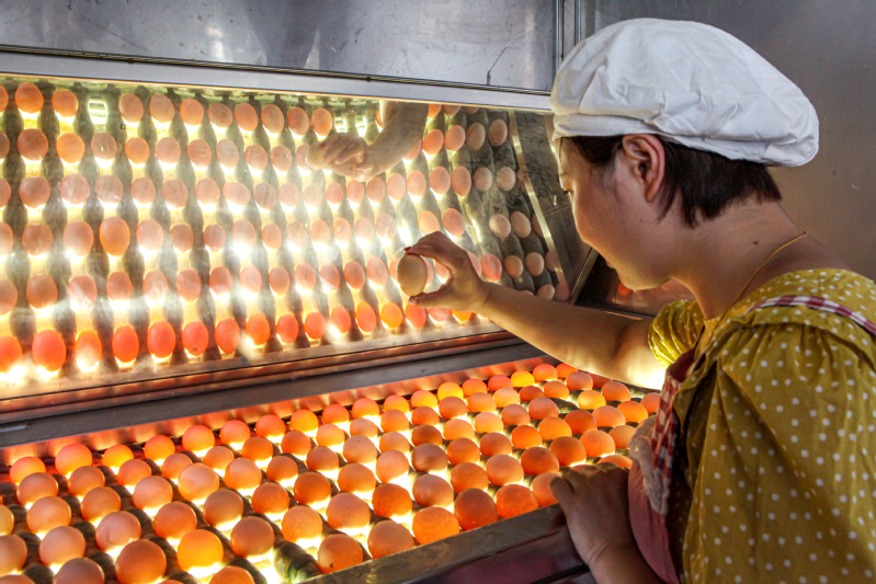 走進新曹農場蛋雞養殖基地現代化雞舍,“層疊式”籠養設備一字排開,一只只蛋雞在干凈舒適的“閣樓”里吃著食槽里的“套餐”,不時有雞蛋滾進輸蛋帶。新曹農場蛋雞養殖有著多年的歷史,“林下草雞”“玉谷”雞蛋更是在墾區及周邊地方名氣很響。近年來,新曹農場以市場為導向,著力發展“一枚蛋”產業。經過多方調研論證,去年,一期項目新建了1棟現代化雞舍,1棟大型蛋庫,僅這一棟雞舍就養殖了8.5萬羽蛋雞。在這里,一人管理一棟雞舍,依靠智能系統能夠實時掌控蛋雞生長情況。“從前我們靠經驗養雞,現在我們靠‘科技’養雞,人員縮減但效益卻增長。”養殖技術員開鵬說。在智能化系統的助力下,基地產蛋率約為95%,雞蛋產品品質提升10%,年產蛋效益提升15%。通過傳輸裝置不停循環,一枚枚雞蛋從雞舍里“滾”了出來,“搭乘”中央集蛋流水線直接來到蛋庫。在全自動蛋品分級設備機上,雞蛋經過清洗、殺菌、分級、人工智能檢測技術、打印“生日檔案”等程序后,根據級別進行分類,最終打包裝箱上市。“以前需要人工一枚枚分揀雞蛋,分揀時間長,分揀質量不高,遇到客戶的大訂單還要加班加點,現在只需要安排幾名職工在設備終端,等待裝滿雞蛋的托盤。”玉谷禽蛋分
